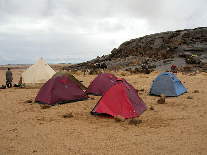 Arrivée à Tamanrasset sous la pluie, ça paraissait plutôt mal parti. Température 17 degrés, après-midi et la première nuit sous tente.