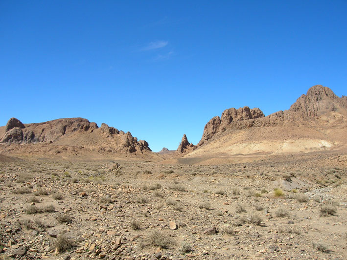 La marche sur des sols caillouteux est parfois pénible. Heureusement qu'au cours d'une méharée le chameau est là pour la monte ce qui est plus agréable. Il faut toutefois savoir partager l'effort avec son compagnon de route, il a aussi besoin d'économiser ses forces. Le chameau (dromadaire) est particulièrement à l'aise sur ce type de terrain. Il nous le démontrera plus tard lors de passages vertigineux à travers des rochers; il a généralement le pied sûr.