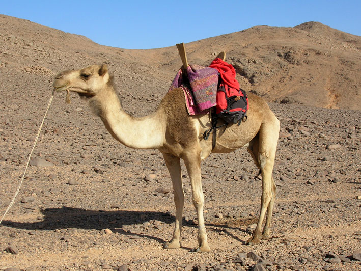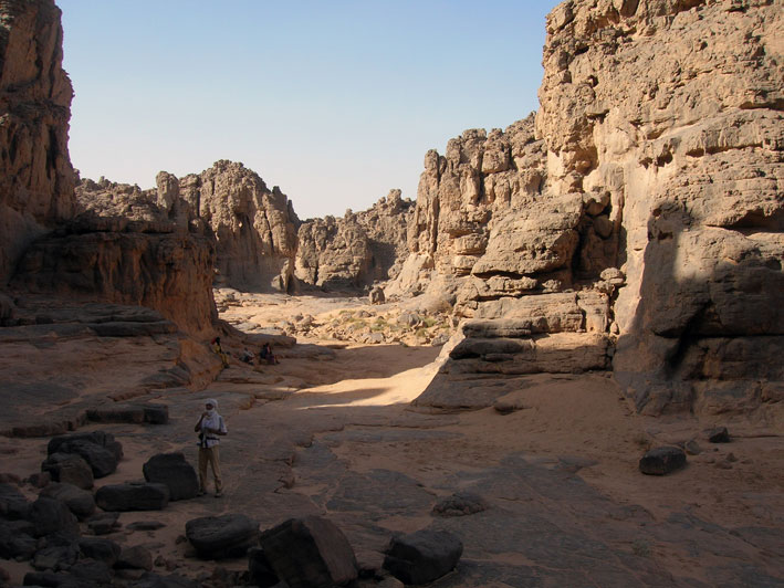 Les deux étapes suivantes ont débuté à pied, matin et après-midi, à travers des zones rocheuses et des canyons magnifiques qui nous ont permis de contempler des peintures rupestres et autres gueltas. Généralement, la caravane nous rejoignait par un itinéraire plus accessibles pour les chameaux et nous continuions sur leur dos.